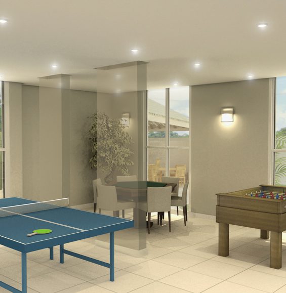 Lazer completo: churrasqueira, playground, sala de ginástica, piscina, salão de festas, quadra, jardim e salão de jogos.